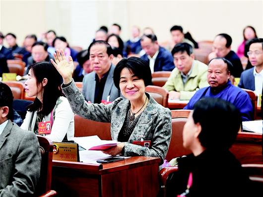 图为:李燕萍举手要求提问。﹙湖北日报全媒记者张朋摄﹚